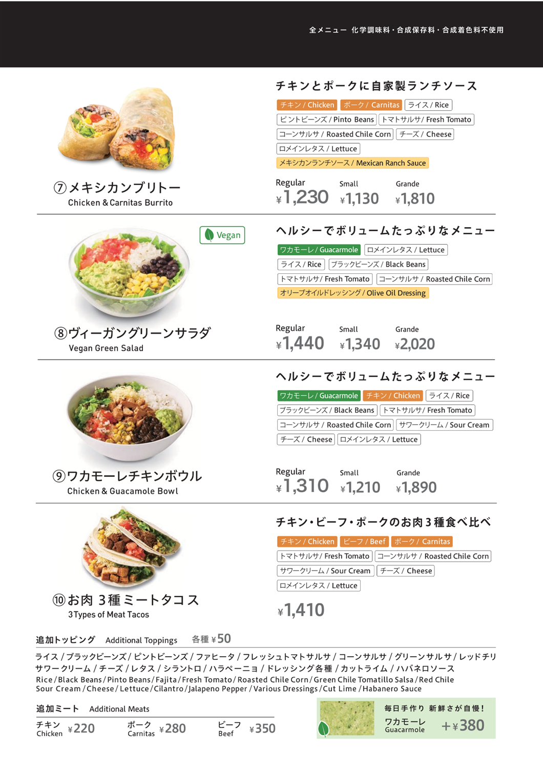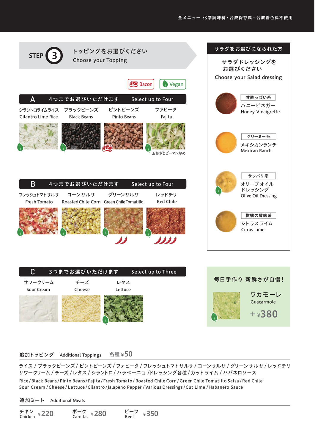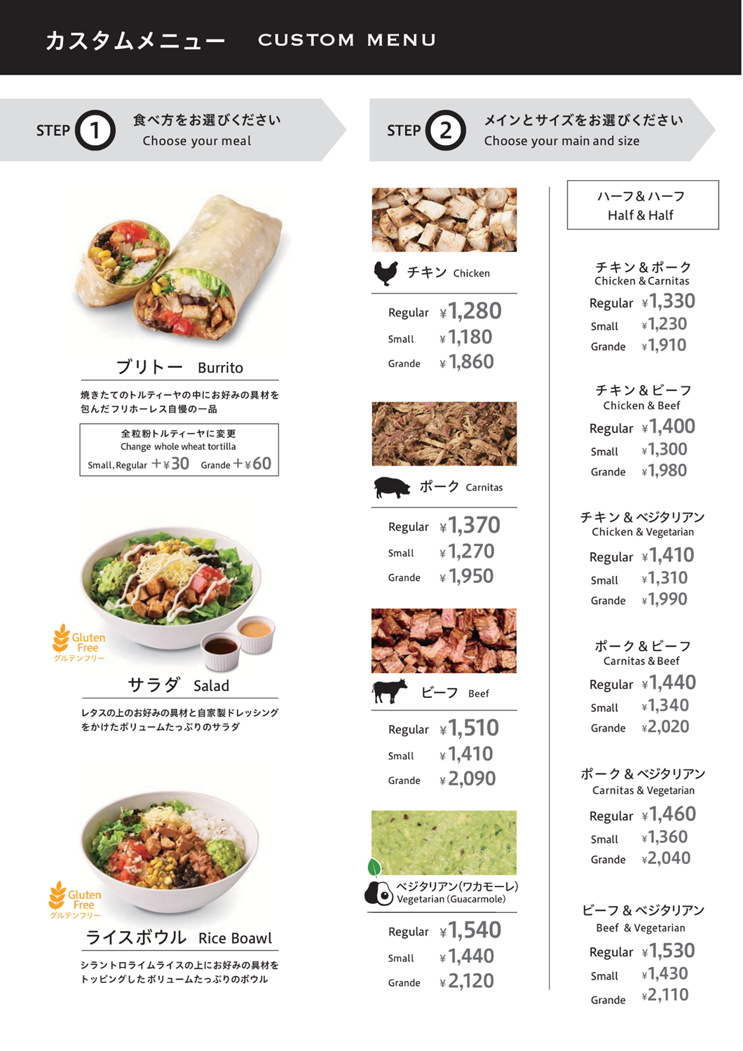 ライムとシラントロと一緒に炊き上げたカリフォルニア米に、あなたのお好みのお肉、ビーンズ、ファヒータベジ、サルサ、チーズ、サワークリームをトッピング。