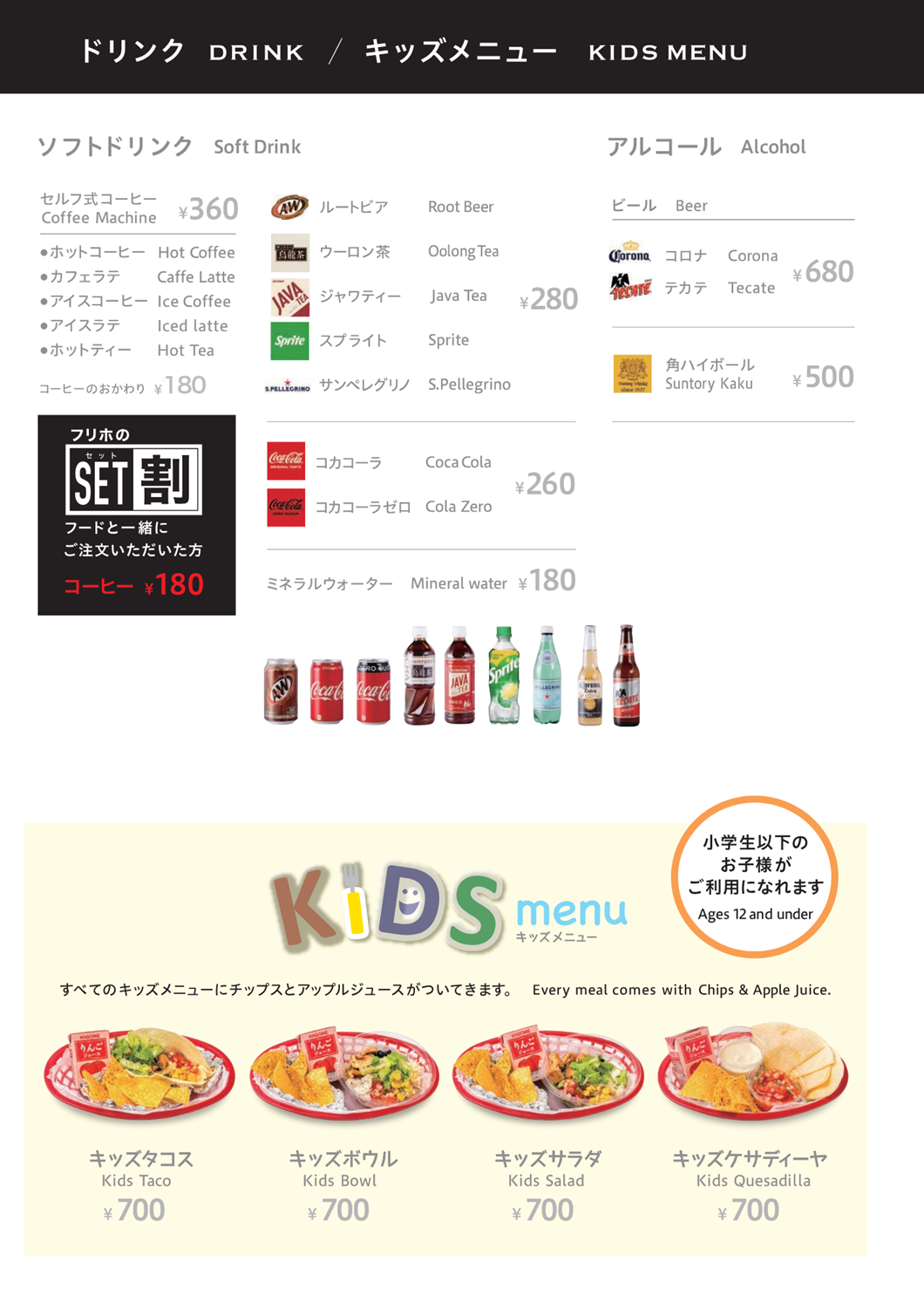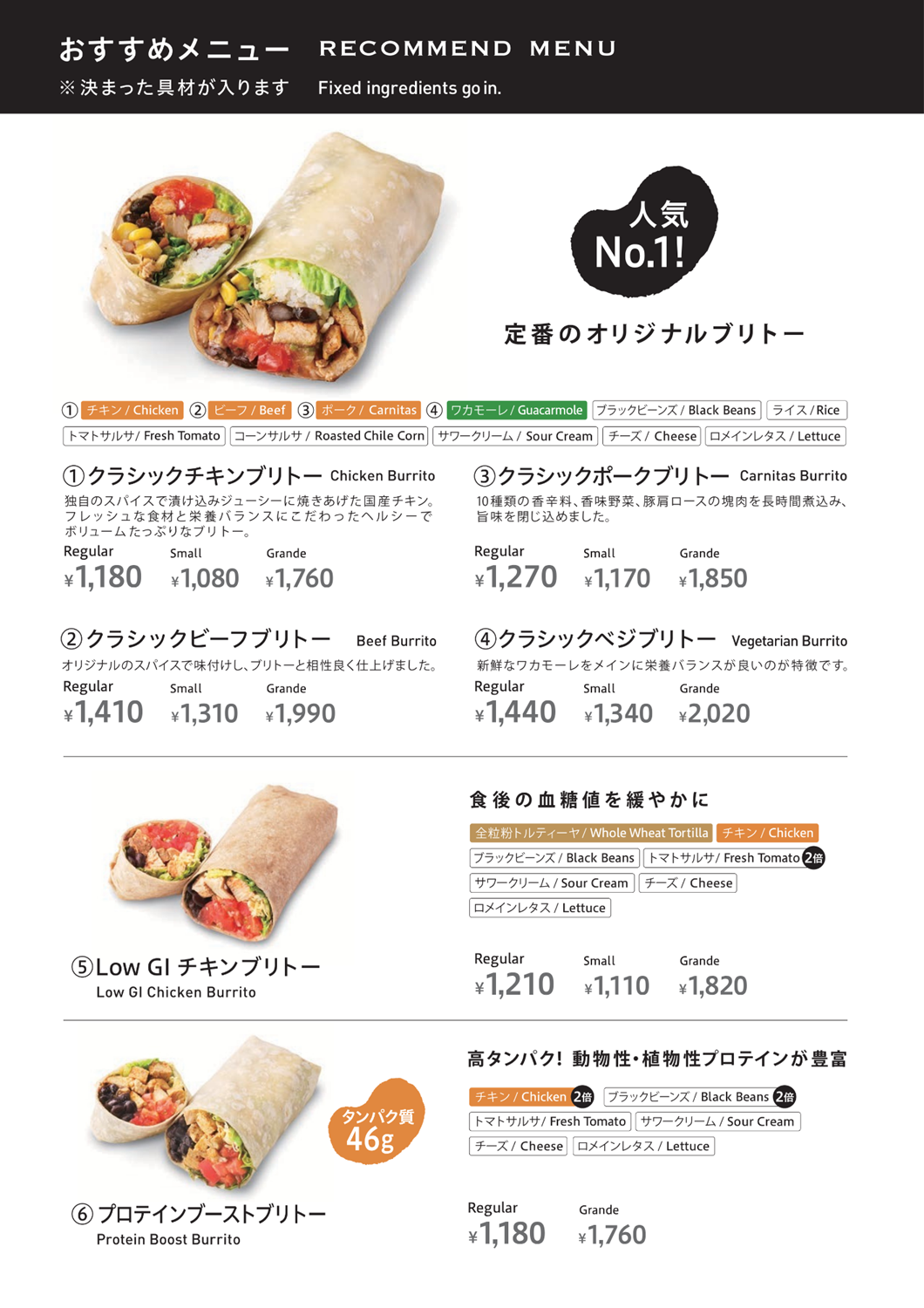 柔らかいトルティーヤの中に、お好みのお肉、ライム、ライス、ビーンズまたはファヒータベジ(炒め野菜)、サルサ、チーズ、サワークリーム、レタスを包んだフリホーレスのおすすめメニュー。ひとつでお腹一杯。