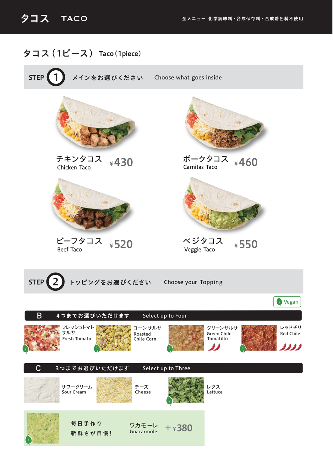 小さめの柔らかいトルティーヤで、あなたのお好みのお肉、サルサ、チーズ、サワークリーム、レタスをはさみます。