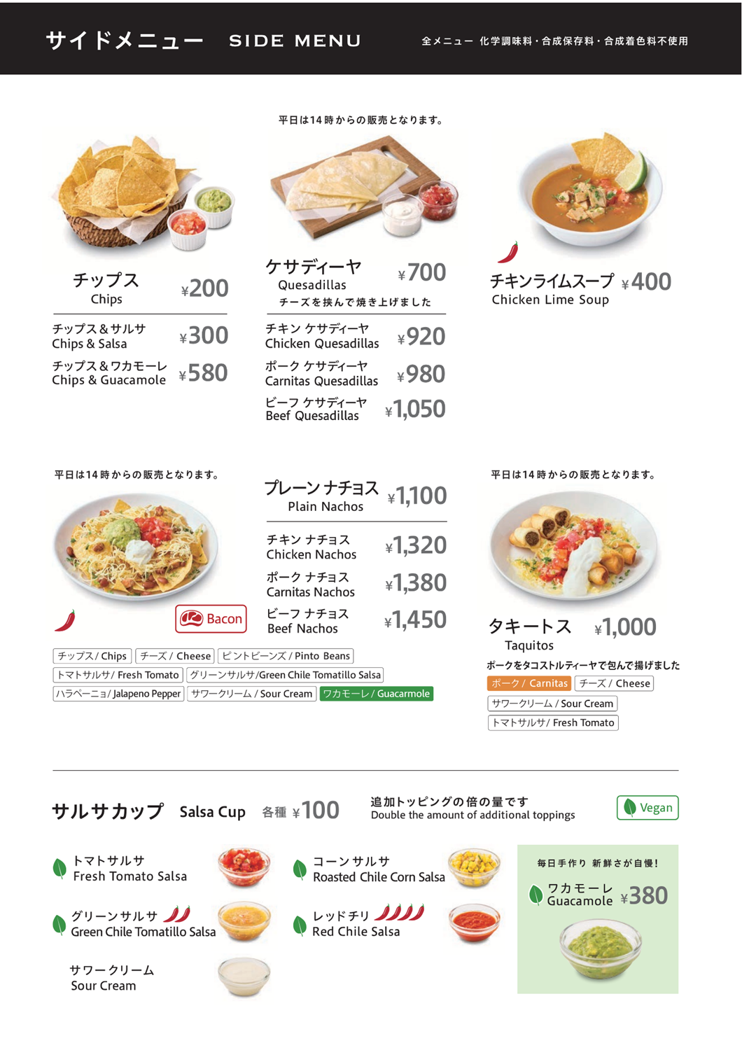 たっぷり新鮮なレタスに、あなたのお好みのお肉、ビーンズまたはファヒータベジ、サルサ、チーズ、サワークリームをトッピング。自家製ハニーヴィネグレット・ドレッシング付。