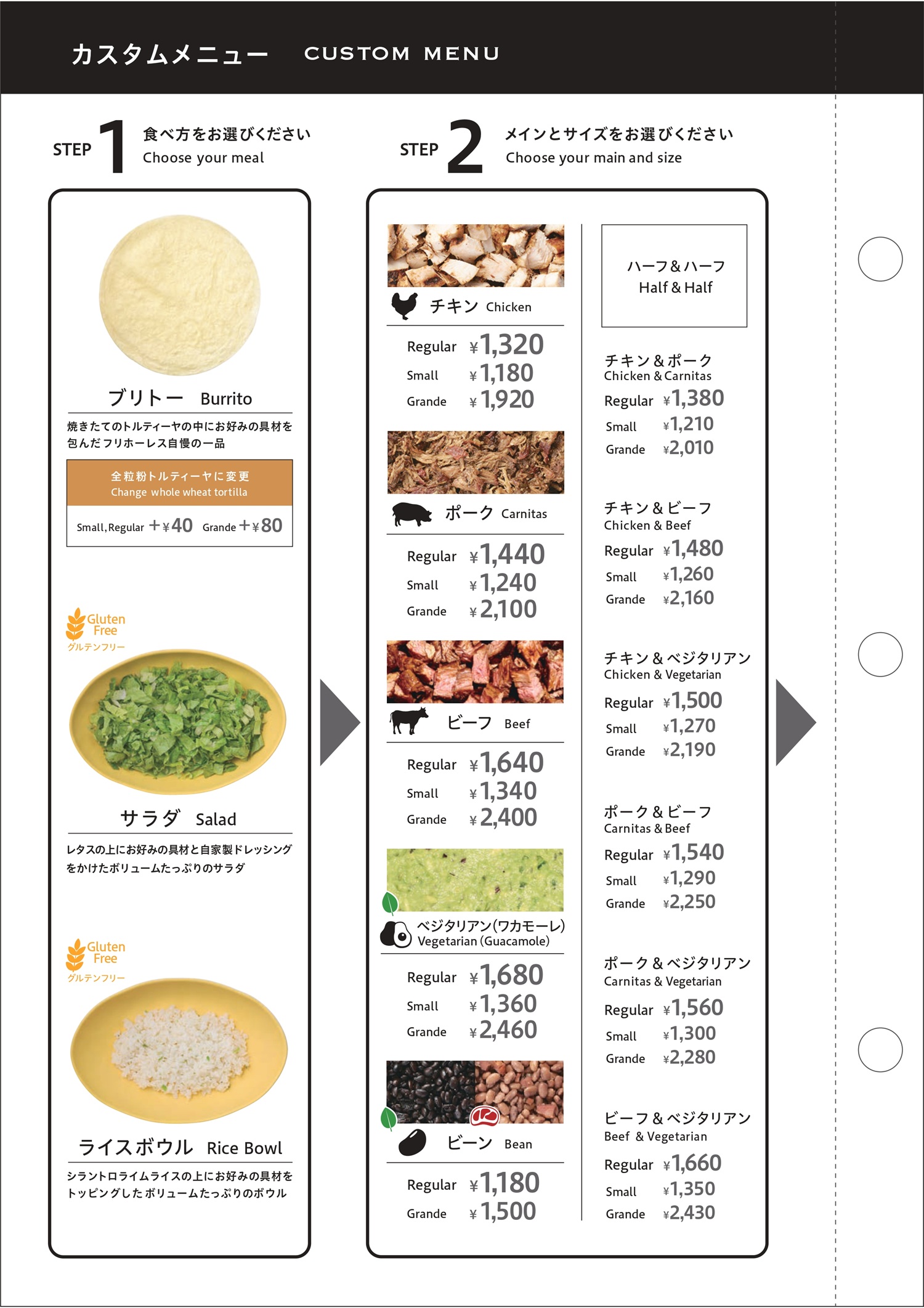 柔らかいトルティーヤの中に、お好みのお肉、ライム、ライス、ビーンズまたはファヒータベジ(炒め野菜)、サルサ、チーズ、サワークリーム、レタスを包んだフリホーレスのおすすめメニュー。ひとつでお腹一杯。