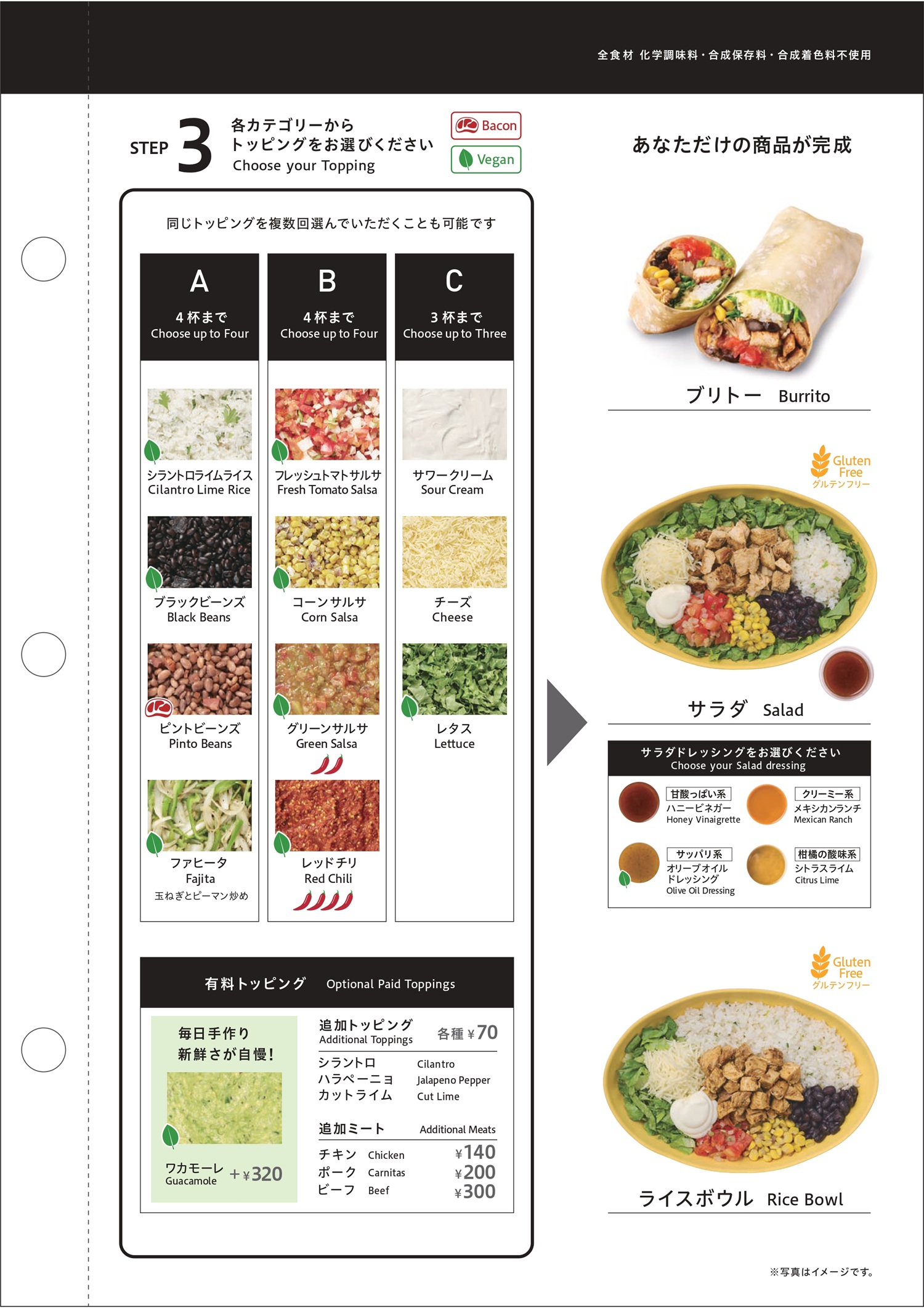 ライムとシラントロと一緒に炊き上げたカリフォルニア米に、あなたのお好みのお肉、ビーンズ、ファヒータベジ、サルサ、チーズ、サワークリームをトッピング。