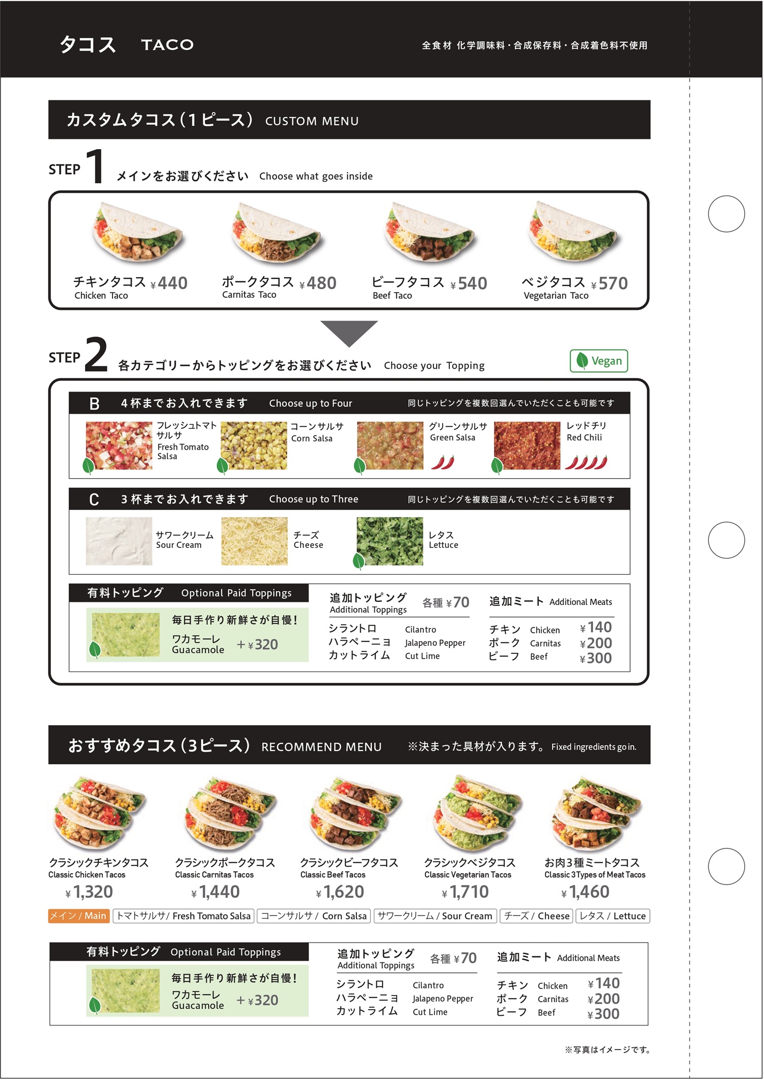小さめの柔らかいトルティーヤで、あなたのお好みのお肉、サルサ、チーズ、サワークリーム、レタスをはさみます。